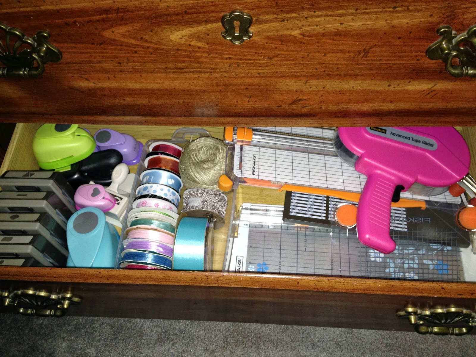 The bottom drawer has my punches, some ribbon, paper trimmers, envelope maker, and ATG!